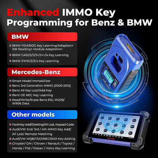 [Top IMMO & Key Programming Tool] Autel IM608 PRO II upgrade of IM608 PRO provides completed IMMO functions that solve all key problems such as key loss, adding new keys, deleting key information, etc. More include Read PIN/CS Codes, Key Generation/Learning, IMMO ECU Reset/Coding, IMMO Data Backup, etc. More, this key programming tool with XP400PRO performs BMW FEM/BDG Key Learning/Adaption+ISN Reading+ Module Adaptation, Benz 3rd Generation IMMO (2005-2013), A-udi/VW/GM key issues, etc.