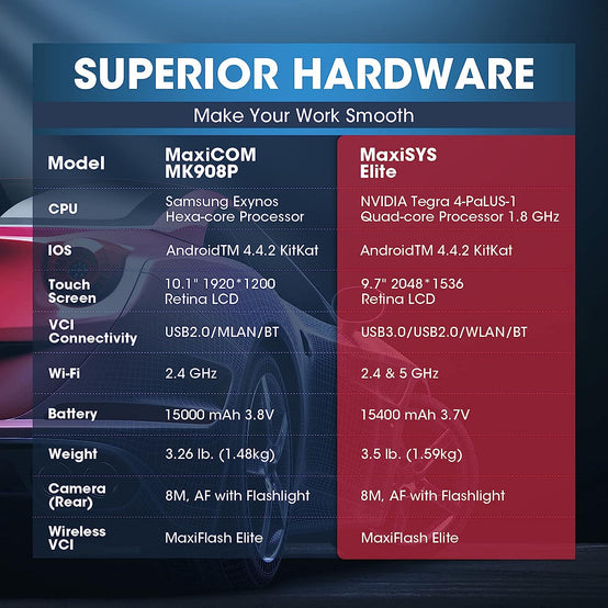 Autel Maxisy Elite II Pro is more advanced than MS908S Pro and MK908P, but much lower cost due to its extended 2-year subscription-free updates; also functionally almost identical to Autel Scanner Ultra, but more affordable: J2534 ECU programming and encoding, 10,000+ car models covered (including luxury cars), 38+ hot features, active testing, Autel Cloud, VAG guided features, restoration data, remote experts...for professionals with a ton of specialized features. This 2023 version of the Autel scanner Elite II Pro has a 9.7-inch Retina display (2048*1536), just like the iPad; Quad-core 1.8GHz NVIDIA Tegra runs 3 times faster than the competition under Android KitKat 4.4.2; and A set of solid hardware, including 2GB RAM and 32GB ROM, USB3.0/2.4 and 5GHz dual WLAN/BT/HDMI/Ethernet connection; 15400mAh battery; 8M rear/2M front camera to maximize the convenience of diagnosis; And one-stop multitasking to keep intertwined programs organized.