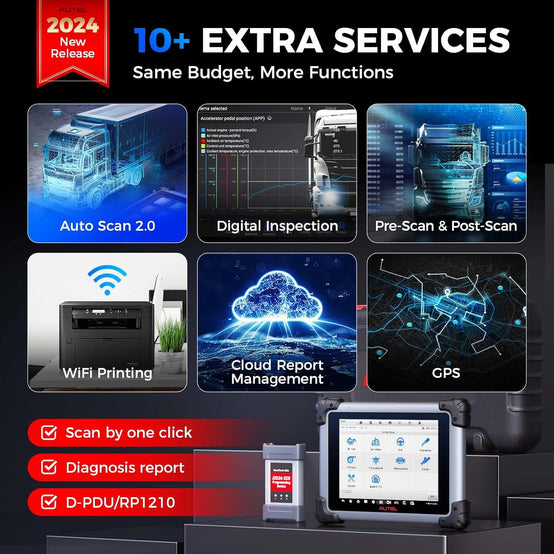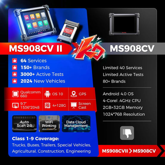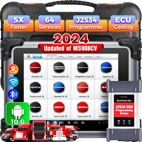 Seeking a great leap forward in faster diagnostic speed, 2024 Autel New Release MS908CV II renews full hardware with the same CPU as MS909CV, fast Android 10, larger 4+128GB, and lasting 15000mAh. Latest tech & updates provide future-proofing power to more CV/HD vehicles (class 1-9). Heavy duty truck scanner MS908CV II comes with improvements in 64+ services, adds 3000+ active tests, enhances ECU coding & J2534 programming for better multitasking.