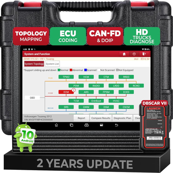 - [Topology Mapping + All Systems Scan] After connecting to the vehicle, you can enter the “Topology Mapping” to perform a deep scan of all on-board systems like CEM, ECM, TCM, ABS/BCM, DIM, ASDM, BBS, IMS, SWM, HUD, SCL, TACM, AUD, etc., to quickly understand interconnections and data flow between ECUs. LAUNCH PROS V+ 5.0 professional escaner automotriz features intuitive color-coded topology showing all structures between vehicle modules, and coupled with 8000+ DTCs and step-by-step guidance to help you cut 70% diagnostic time. See results at a glance, simply click to check faults!